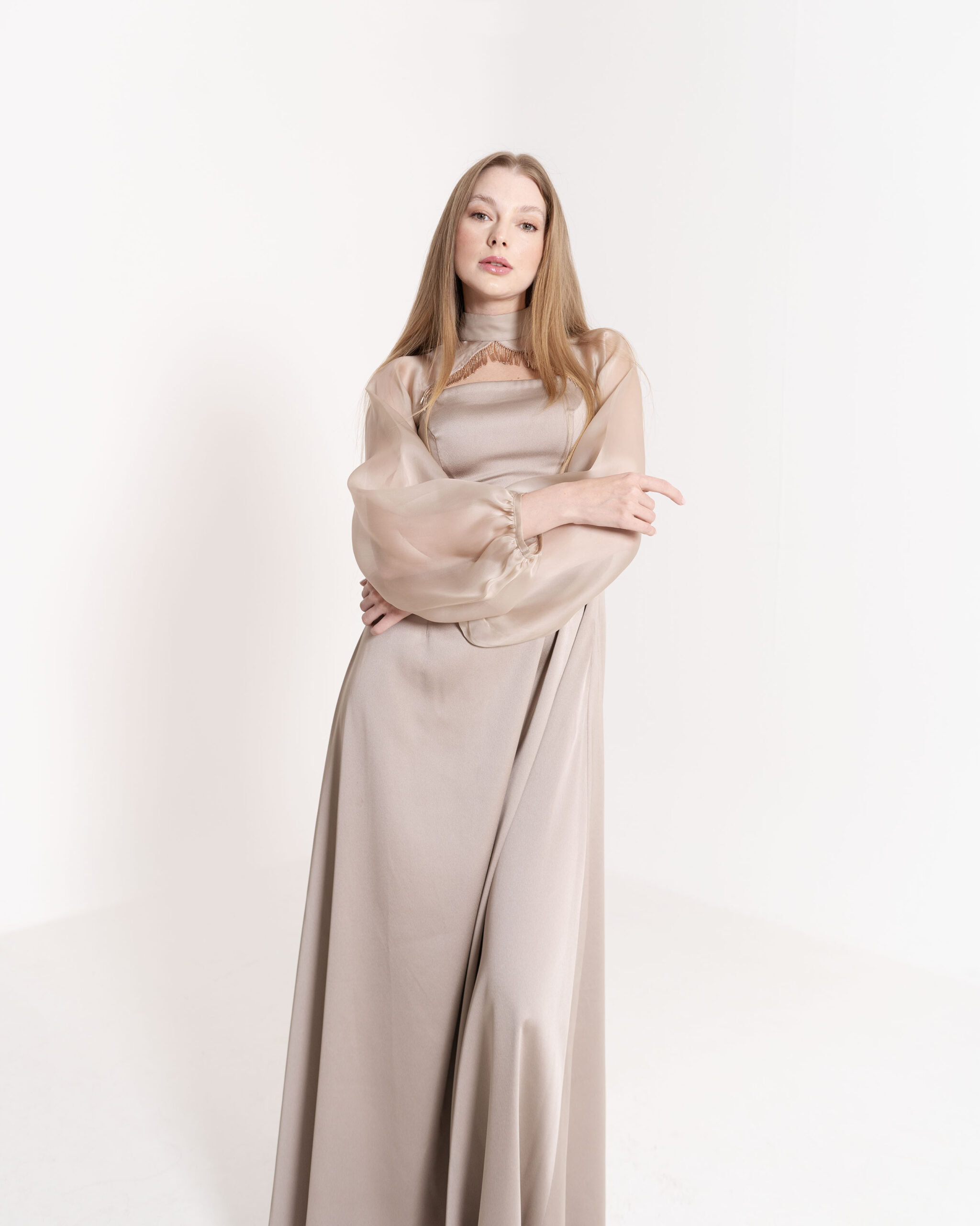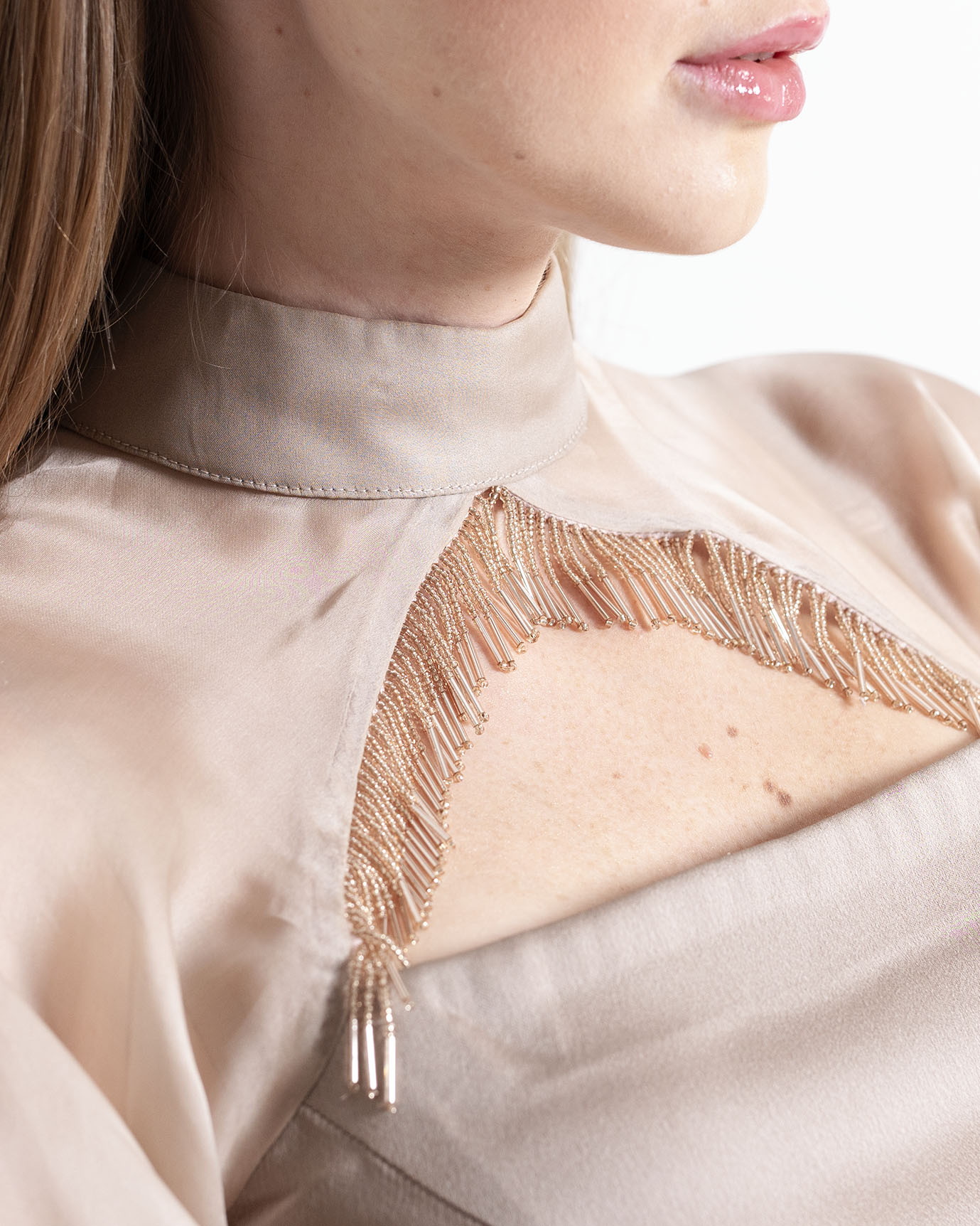 A piece made from luxurious silk blended crepe fabric with natural gazar sleeves, adorned with an elegant rose gold accessory.